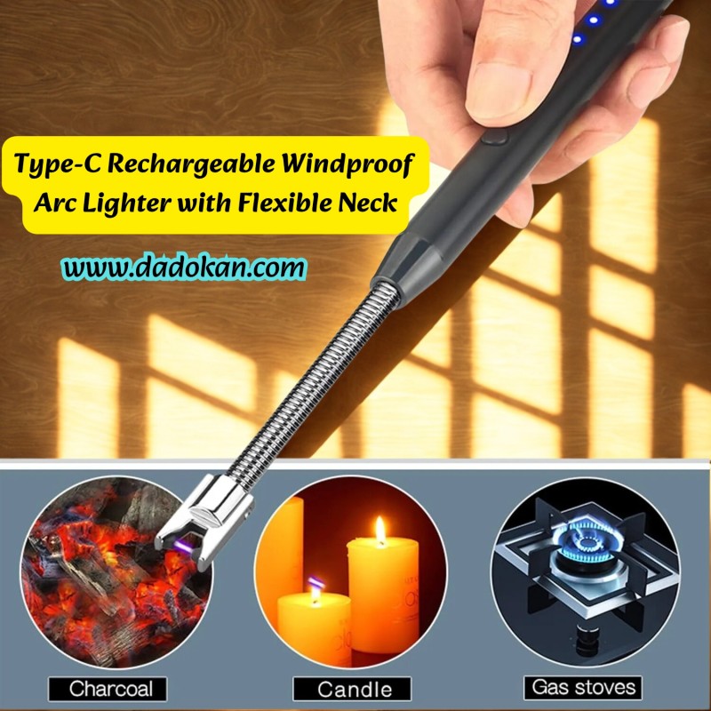 আগুনের ঝামেলাহীন আধুনিক লাইফস্টাইলের জন্য নিয়ে এলাম Type-C রিচার্জেবল উইন্ডপ্রুফ আর্ক লাইটার। এটি গ্যাস বা তেলের ঝামেলা ছাড়াই ইলেকট্রিক আর্কের মাধ্যমে কাজ করে, যা পরিবেশবান্ধব এবং নিরাপদ। এর ৩৬০° ফ্লেক্সিবল নেক দিয়ে আপনি যেকোনো কঠিন কোণেও সহজে আগুন জ্বালাতে পারবেন।